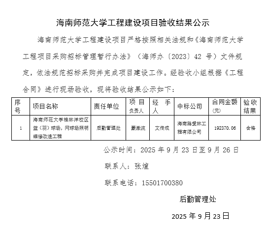海南师范大学工程建设项目严格按照相关法规和《海南师范大学工程项目采购招标管理暂行办法》(海师办〔2023〕42 号)文件规定,依法规范招标采购并完成项目建设工作。经项目使用单位试用正常后提出验收申请,验收小组根据《采购合同》进行现场验收,现将验收结果公示如下: