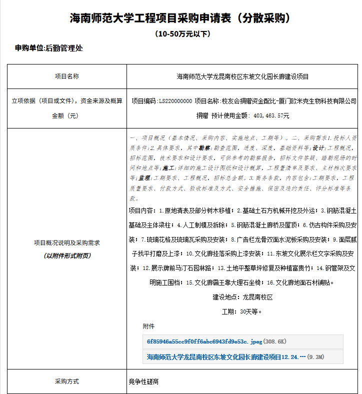为建设我校龙昆南校区文化景观,宣扬苏东坡文化,现对东坡文化长廊进行改造。根据学校采购流程,现进行采购公示,如需咨询相关事宜,请致电0898-65882341符老师。